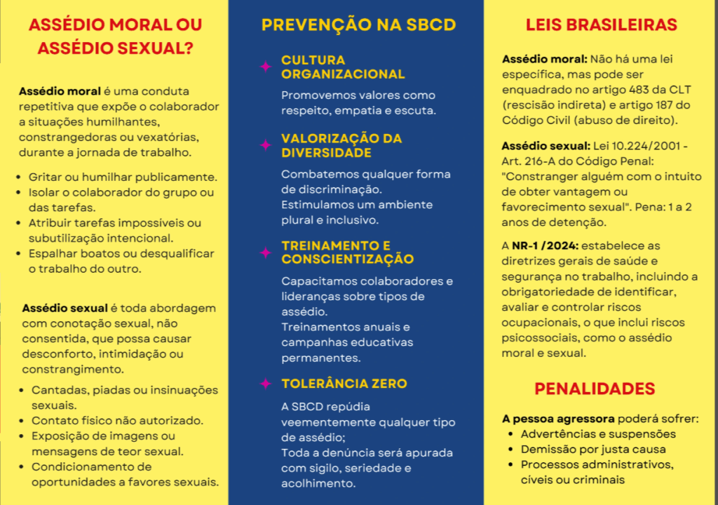 Durante o encontro, utilizou-se como material de apoio a cartilha da SBCD sobre assédio moral e sexual. Ela reforça a importância da prevenção, da conscientização e da política de tolerância zero diante de qualquer forma de violência.