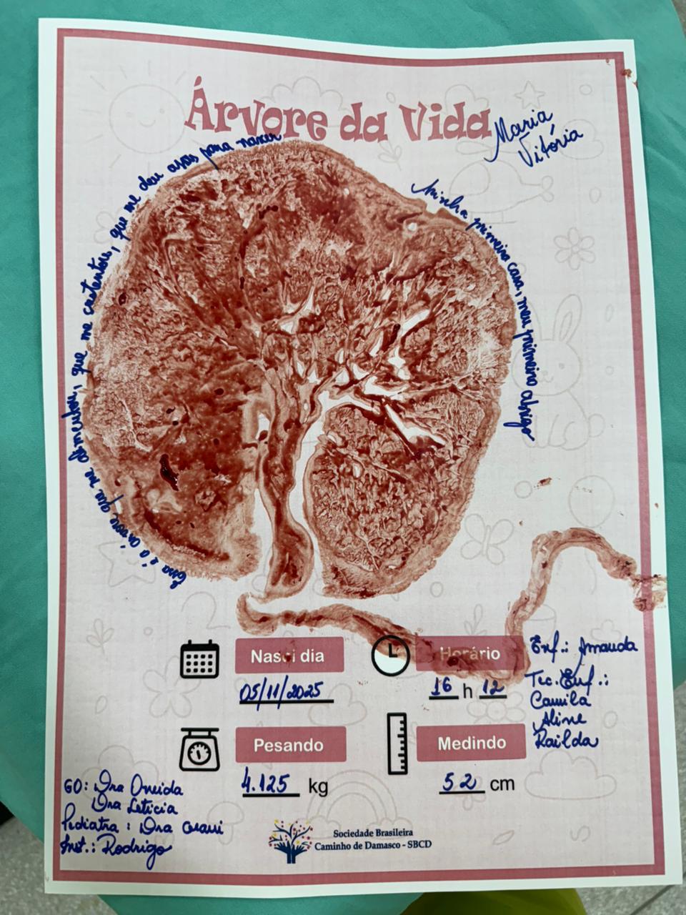 A iniciativa “Árvore da Vida” consiste em uma arte simbólica feita a partir da placenta, representando o elo que une mãe e bebê.