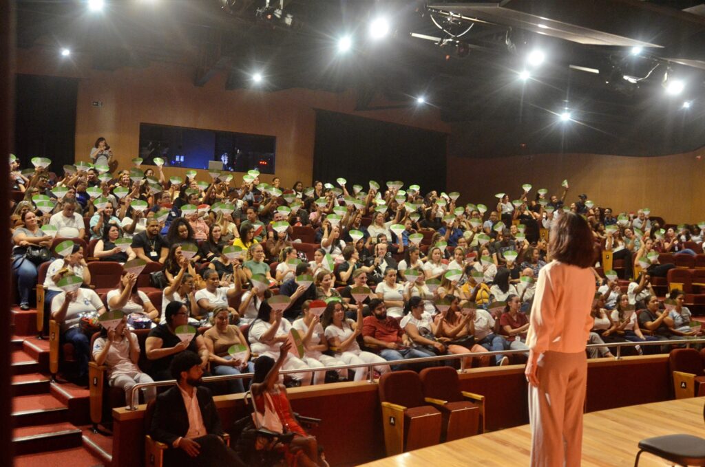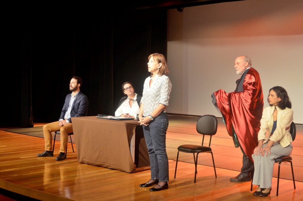Profissionais que atuam na Saúde de Cubatão (SP) tiveram a oportunidade de assistir ao espetáculo teatral “HIV no Tribunal”, uma experiência interativa em que o palco se transforma em um tribunal e a plateia assume o papel de júri. A peça convida o público a refletir sobre temas como HIV, preconceito, responsabilidade afetiva, fake news e acesso à informação.