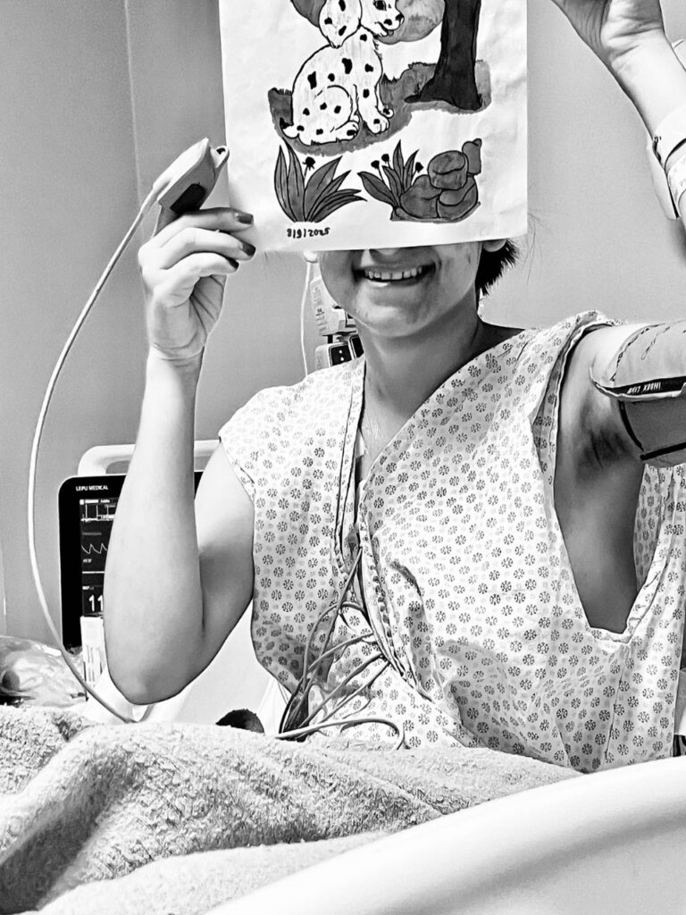 “A foto poderia se chamar O Sorriso Improvável, mas humanizadamente possível. O contraste entre a tecnologia da UTI e a arte criada pela paciente é o que deu vida à cena”, descreve o Dr. Tomio.